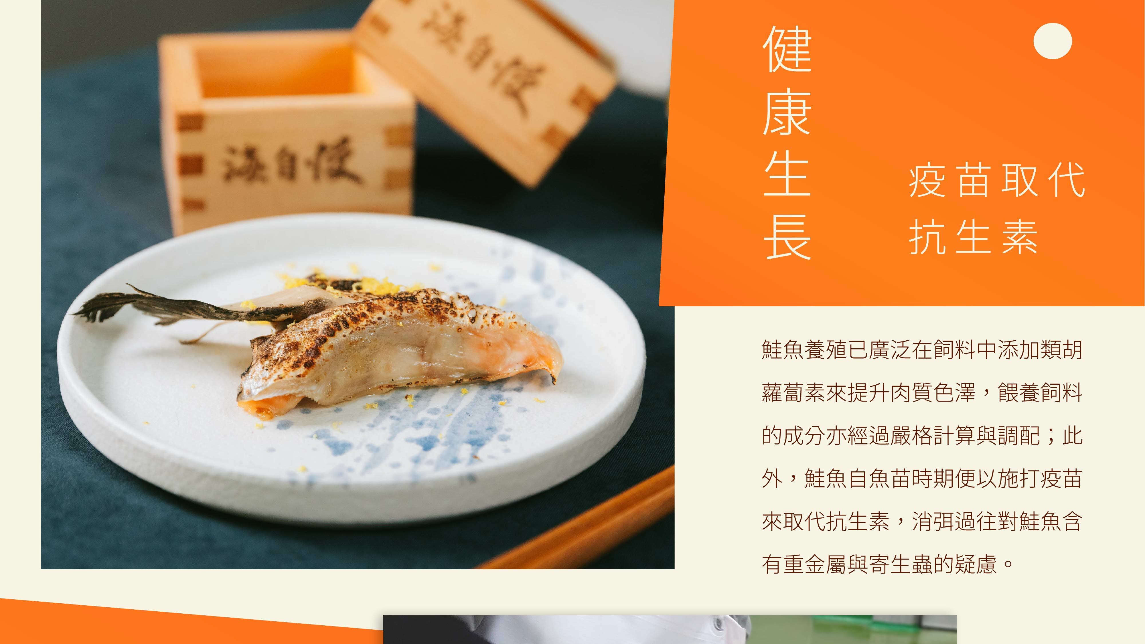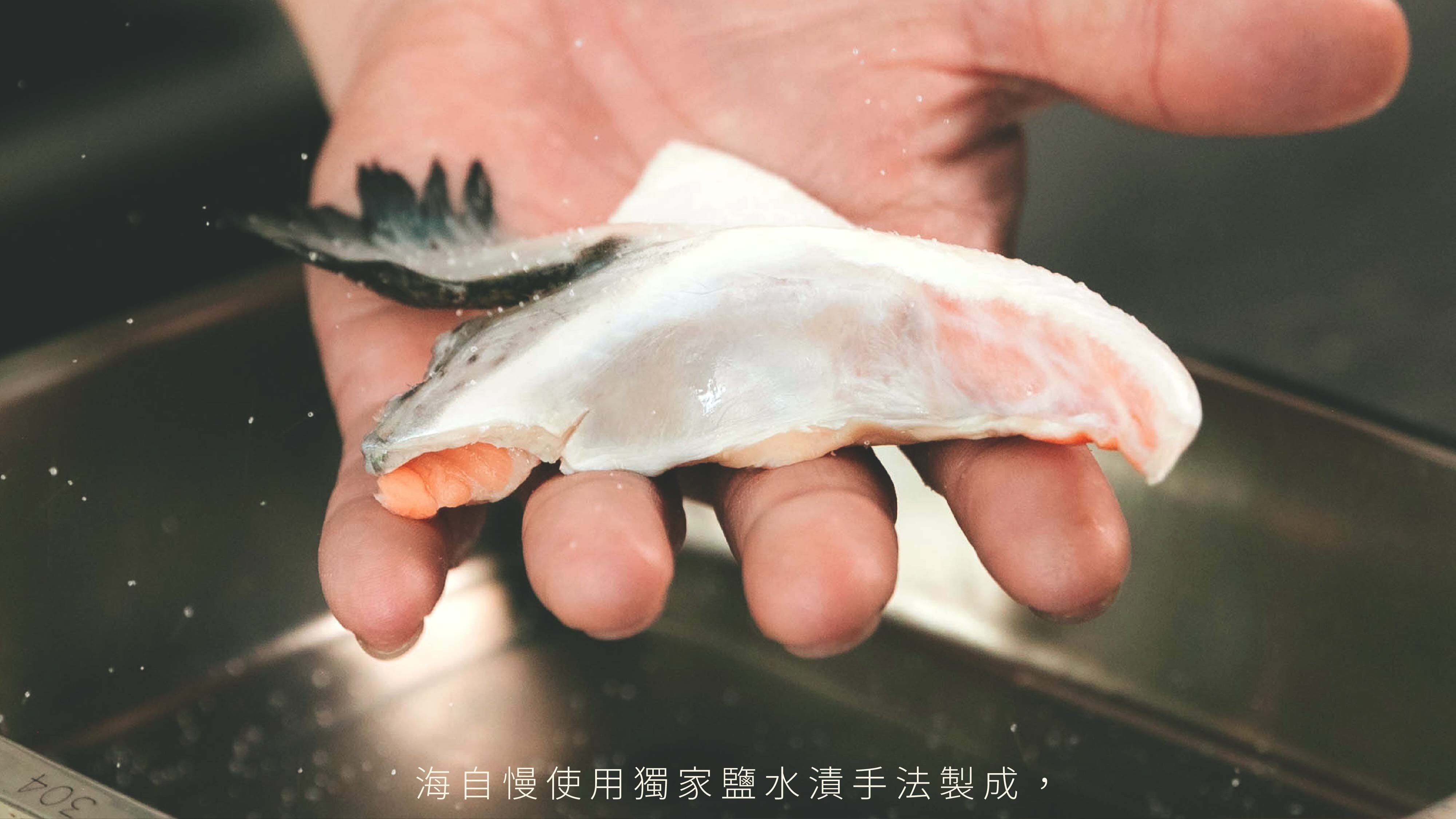 海自慢選用來自智利的鮭魚,肉質軟嫩含有大量蛋白質、Omega-3 脂肪酸、鈣、鐵、維生素B群等營養素,魚油中的 DHA 、EPA 幫助血液順暢及活化腦部。智利南海為鮭魚之國,也因屬高緯度地區海水低溫,使魚隻體內儲存更豐厚的油脂,因此食用起來格外柔嫩細緻,且極具營養價值。再加上海自慢獨家鹽漬手法,保留原本風味,反而使肉質更佳紮實,亦能提引出⻝材的鮮甜滋味。